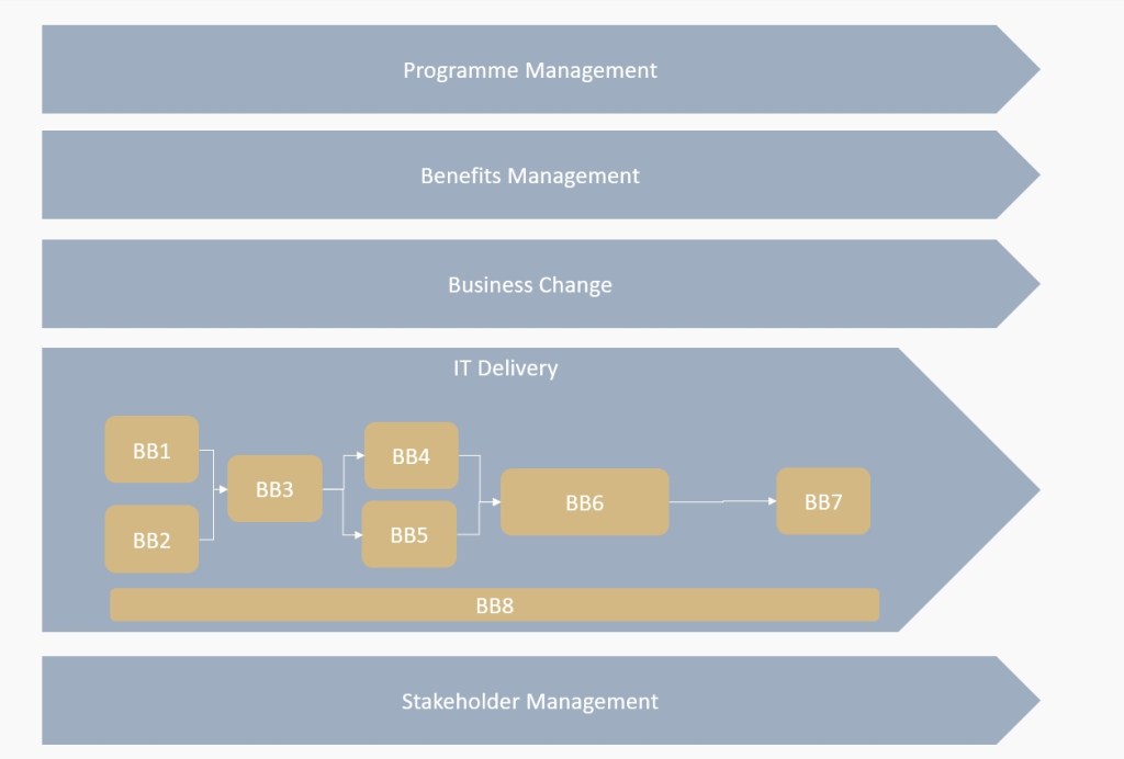 Rather than a single technology delivery workstream within a Programme, delivery should be broken down into a number of discrete deliveries of Building Blocks, each delivered by a separate team and with well-defined starts and ends (ideally coincident with the individual projects or work packages).