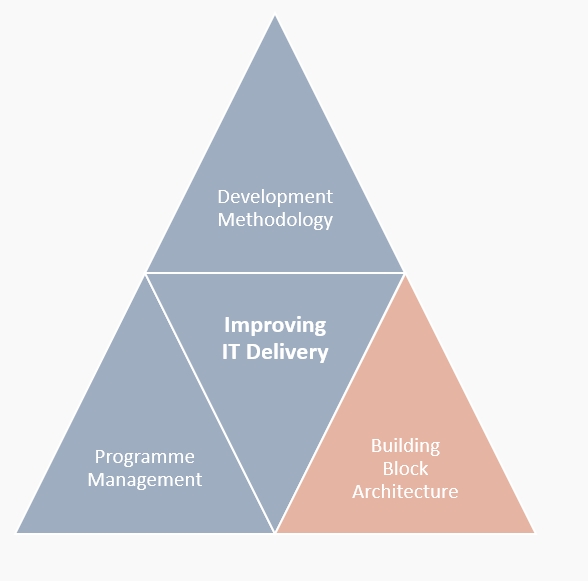 However, many projects may require more than 20 developers. So, to deliver successfully with small teams in this ‘programme of projects’ world, I believe that there is an additional and fundamental component required – for these larger programmes, we need to break down the development into smaller, discrete pieces of work – each piece of work called a ‘Building Block’. In addition, an integrating IT architectural ‘guiding mind’ is also required to provide the vison and oversee and integrate the whole.
